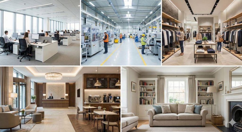 This visual highlights the diverse range of interior designing solutions offered by Ifra Relocation Solutions, showcasing our expertise across corporate offices, industrial and manufacturing facilities, hospitality and commercial environments, as well as residential living spaces. Each design reflects our commitment to creating well-planned, functional, and visually appealing interiors that enhance productivity, comfort, and overall experience. From modern office workspaces and efficient industrial layouts to elegant hospitality settings and warm, inviting homes, our approach combines thoughtful space planning, aesthetic balance, and practical execution. Every project is designed with purpose, ensuring that the space not only looks exceptional but also supports the needs of those who use it every day.